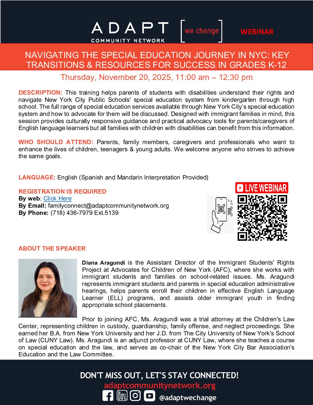 Thursday, November 20, 2025, 11:00 am – 12:30 pm DESCRIPTION: This training helps parents of students with disabilities understand their rights and navigate New York City Public Schools' special education system from kindergarten through high school. The full range of special education services available through New York City’s special education system and how to advocate… Read More »Free Webinar-ADAPT COMMUNITY NETWORK_NAVIGATING THE SPECIAL EDUCATION JOURNEY IN NYC: KEY TRANSITIONS & RESOURCES FOR SUCCESS IN GRADES K-12 |