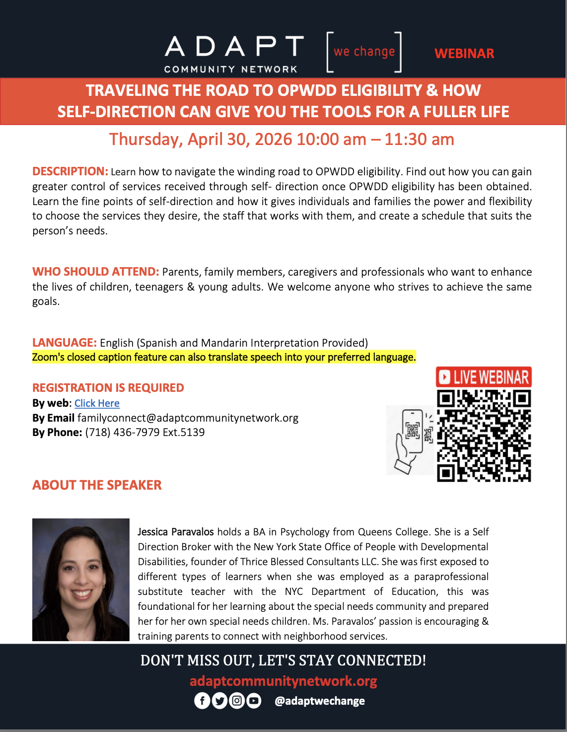 Online via ZoomDate: April 30th 10am - 11:30am DESCRIPTION: Learn how to navigate the winding road to OPWDD eligibility. Find out how you can gain greater control of services received through self-… Read More »ADAPT FREE WEBINAR: Traveling the Road to OPWDD Eligibility & How Self-Direction Can Give You the Tools for a Fuller Life